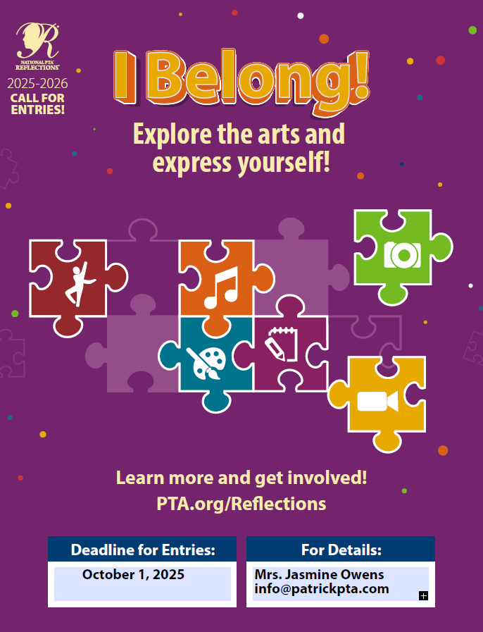 Questions? Contact Mrs. Jasmine Owens, Patrick PTA Reflections Chair at jasmineowenspta@gmail.com